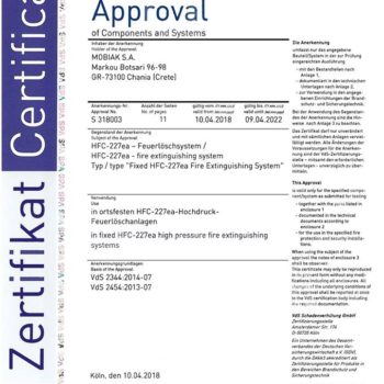We are extremely pleased to inform our associates that our company has obtained a VDS Certificate for the Full Suppression System HFC-227ea!